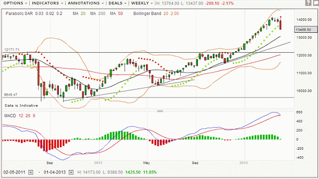 The chart below is the weekly for the 250 and it is suggesting that the current trend is at the very least having a rest, there are negative signs although it could still stay in an upward direction provided it doesn't fall much below 13000. Moving averages are still positive and we have support points below, the major one being around 12200. MACD however does look like it is about to go down, but it is still some way off zero, the crossover of which is usually the bearish signal. Bears would be jumping the gun by going short now on the basis if this chart. It's important to remember that the FTSE250 can move a long way very quickly, although bulls should start being worried if we have one or two more days like today close together. A lot to play for next week I think.